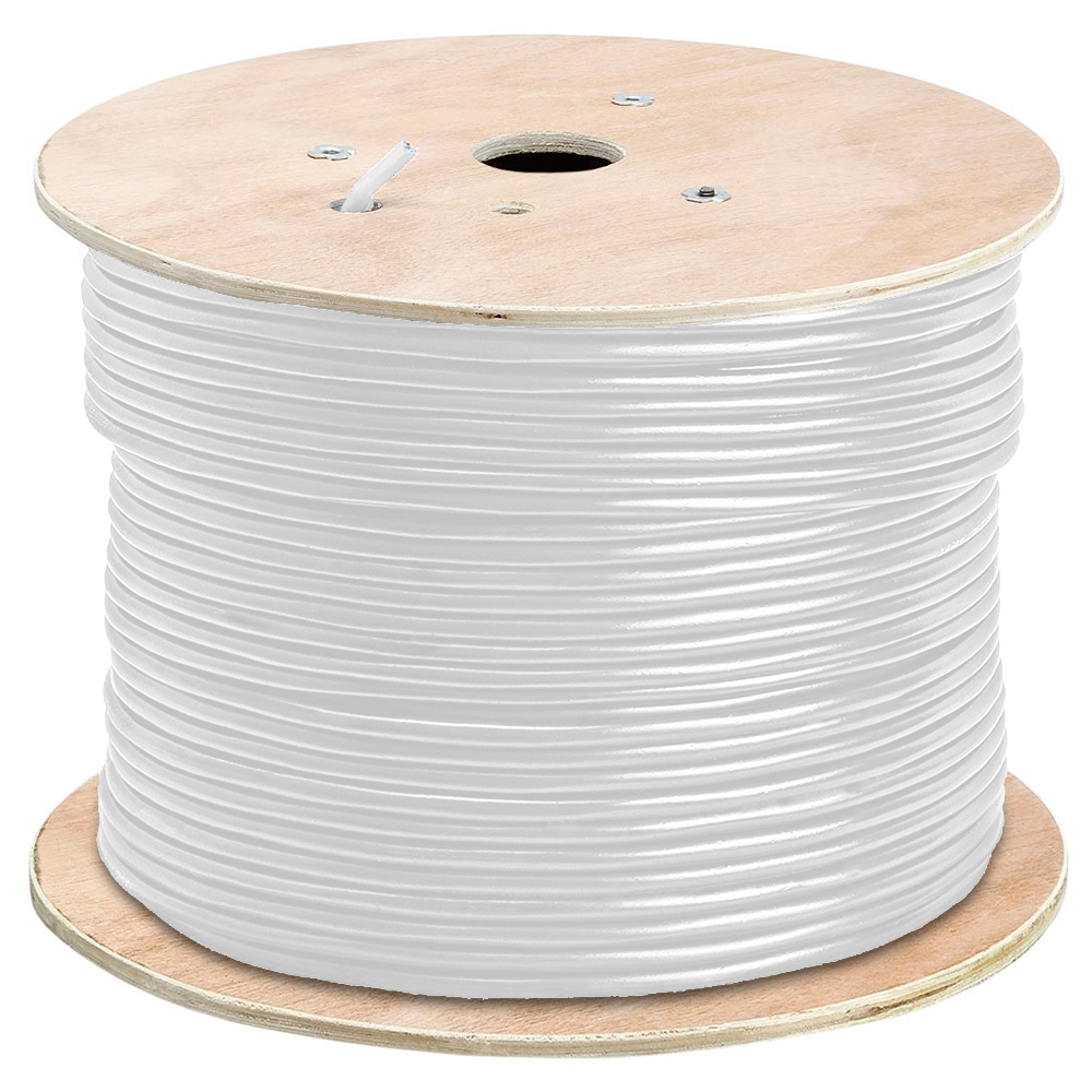 Cat6a bulk 10 Gigabit Ethernet cable, 23AWG bare copper UTP conductors, data transfer speeds up to 750 MHz, 1000 feet, white. CMR-rated for in-wall, ceilings, and risers.