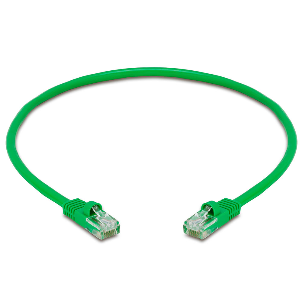 RJ45 Cat5e Ethernet LAN network cable. Supports speeds up to 350 MHz, protects against radio frequency/electrical interference and crosstalk. 1.5 feet, stranded 568B wire, molded strain relief, green.
