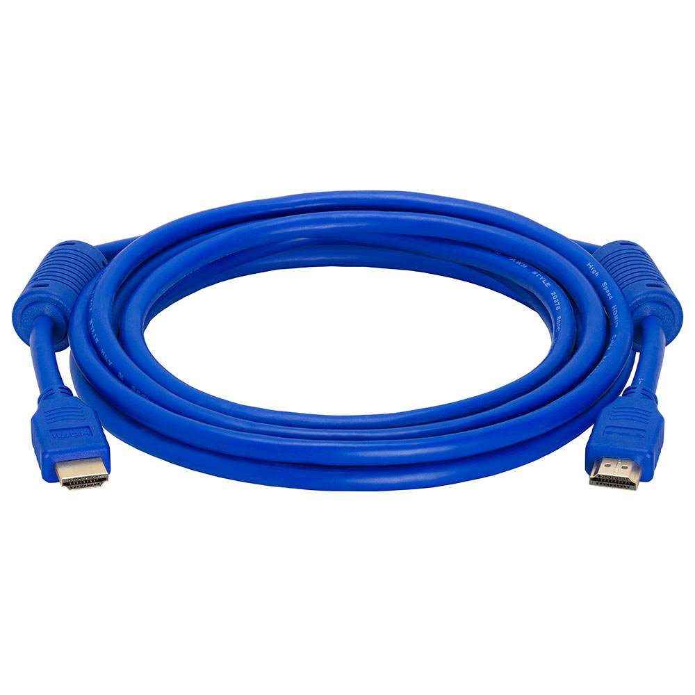 High speed 10 ft HDMI cable with ferrite cores. Supports up to 4K resolution, 3D compatible. Ideal for newest HDTVs, high-res digital audio with extra color spaces, audio return channel. 28 AWG. Blue