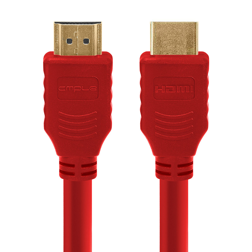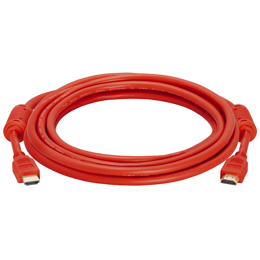 High speed 10 ft HDMI cable with ferrite cores. Supports up to 4K resolution, 3D compatible. Ideal for newest HDTVs, high-res digital audio with extra color spaces, audio return channel. 28 AWG. Red