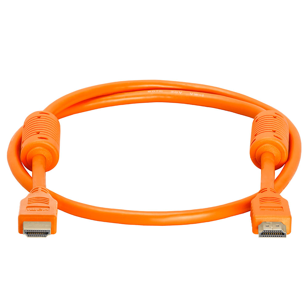 High speed 3 ft HDMI cable with ferrite cores. Supports up to 4K resolution, 3D compatible. Ideal for newest HDTVs, high-res digital audio with extra color spaces, audio return channel. 28 AWG. Orange