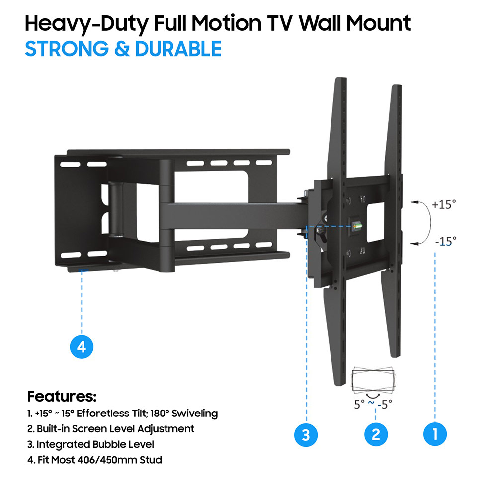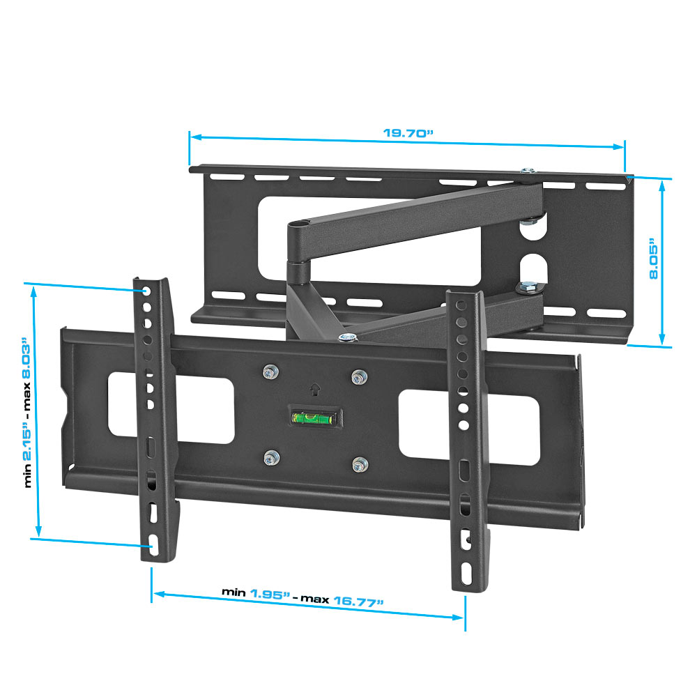 Heavy Duty Full Motion TV Wall Mount for 32”-55” Flat and Curved TVs 1055-N Heavy Duty Full Motion Wall Mount is a mount that has the capacity of holding up to 25kg/55lbs that fits most 32inch-55inch TVs.The mount allows easy adjustment of tilt (without additional tools) in the range from -15° to 15°.It is also possible to rotate the panel horizontally (+/-90°) and adjust the distance from the wall (125 mm to 615 mm).Additionally, the panel can be leveled (skew adjustment within -5° to 5°). The built-in bubble level allows for precise and fast installation. Full motion allows maximum flexibility – extends, tilt and swivel your TV left and right for easy viewing from any seat in a room.Its built-in level adjustment ensures perfect positioning. It combines integrated cable management features and bubble level to ensure easy alignment. 1055-N allows the user to adjust the screen in 3 planes. After changing the position of the panel, it may be necessary to correct the level of the screen- all adjustments can be performed manually in seconds, without any additional tools.A slight downward inclination of the arm is typical and does not affect the safety and functionality of the bracket. Safety warning. The set includes assembly instructions. If you do not understand those directions, or have any doubts about the safety of the installation, please call a qualified installer. Features & Specifications: Universal hole patterns 426mm x 204mm (16.77 in x 8.03 in) VESA: 200×200, 400×200, 300×300, 400×400, 600×400 Distance from TV to Wall: 125mm-615mm(4.92 in – 24.21 in) Holds TV up to 55 LB Integrated bubble level assures easy installation alignment Open architecture provides superior ventilation and easy access for cable management Built-in screen level adjustment