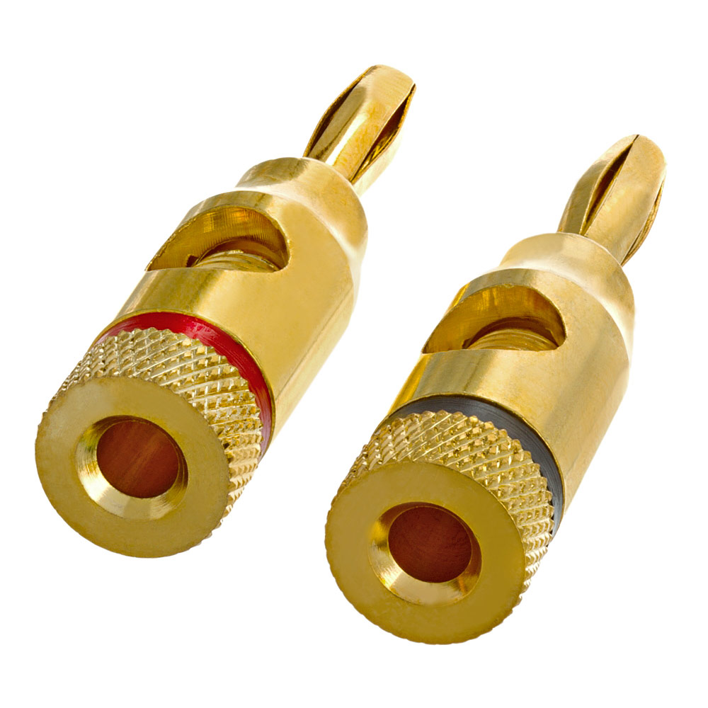 High quality, gold plated, banana plugs. Banana plugs make speaker installation a breeze. No more worrying about stray strands shorting across terminals and overloading your equipment. These sturdy plugs look nice and provide a solid contact. Can accept bare wire, spades or other banana plugs. Can accept 24 to 12 AWG speaker wires. Color coded black/red rings for maintaining proper polarity. Secure, positive conntact with binding posts. Corrosion resistant, gold plated finish Cooper body construction and ferromanganese tips Each order is a pair (2 plugs) Type: Screw type Banana Plugs Terminations: Bare Wire, Spades or Piggyback banana plugs Length: 1.75 inches Construction: Copper body and tip base. Ferromanganese Tip. All gold plated. Units per order: 2 total – 1 black ringed & 1 red ringed Acceptable Gauges: 24AWG to 12AWG.