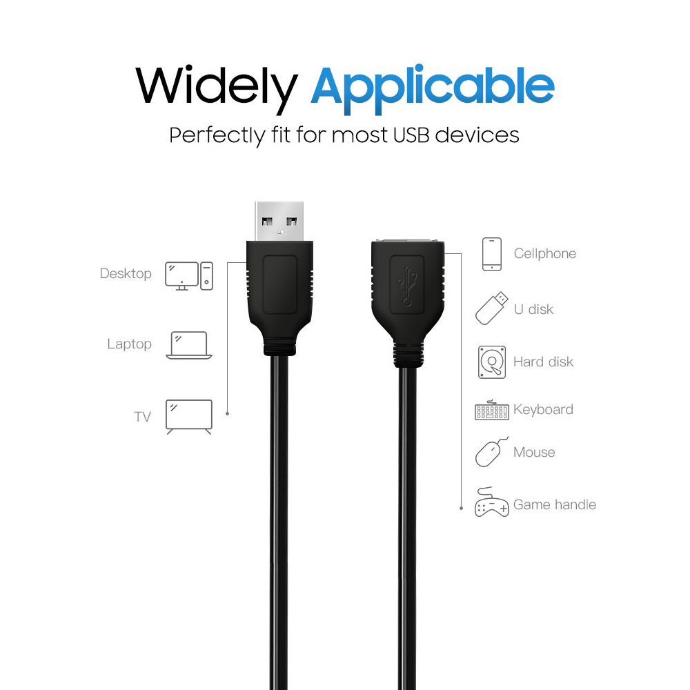USB 2.0 A Male to A Female Extension Cable – 3ft(Black) Our USB 2.0 A Male to A Female extension cable was made exactly for connection between a computer (Mac/PC) & a Smartphone, MP3 player, tablet, keyboard, mouse, camera, external hard drive, printer, VoIP phone or other USB-enabled device. It’s ideal for lengthening cables that are too short, while giving you the convenience to move around with connected devices to easily plug any peripheral or outside equipment into your computer via USB. It even allows you to leave this cable permanently attached to your machine, so you can just plug a MP3 player, tablet, keyboard, mouse, camera, external hard drive, printer, VoIP phone or other USB-enabled device and unplug anything into it without having to get on your knees or back behind the computer. Top performance and exceptional quality throughout. It’s constructed from high-grade cable with a strong PVC jacket and molded connectors on both ends, so you get optimal signal transfer without loss of data speed. It’s fully compliant with USB 2.0 standards, which also means that it’s backward compatible to USB 1.0 and 1.1; you can use it for all of your USB devices, not just the ones using 2.0 Extend the distance of your USB cable USB 2.0 compliant, compatible with USB 1.0 Connectors: USB A Male to A Female Supports high speed data transmission to 480 Mbps RoHS Compliant Lifetime Warranty Color: Black Length: 3 FT Wouldn’t it be nice to put your printer or portable hard drive where you want it, and not where it has to go because of the length of its USB cable? Wouldn’t it be terrific to connect your iPod or camera to your computer, and then sit the camera or player right next to you on your desk so you could operate everything comfortably and conveniently? Our male to female USB 2.0 extension cable can make all of your dreams come true.