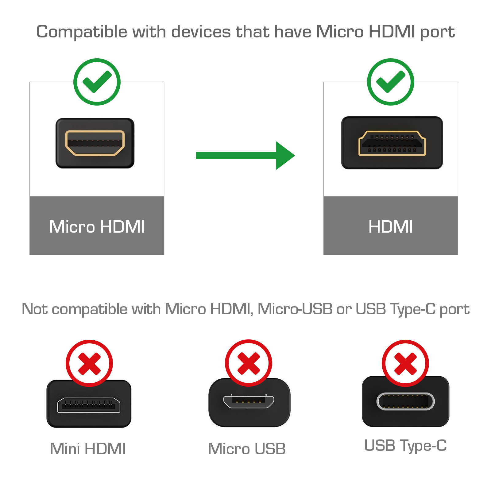 6FT Micro-HDMI (Type D) to HDMI (Type A) Cable Please check your mobile owners manual to see if your mobile device is comparable with the Micro HDMI This extra thin and flexible Micro HDMI High-Speed Male To HDMI Male Cable is used to connect Smartphone’s, cameras, and other portable devices into any TV lets you instantly plug your tablet, GoPro, Lenovo Yoga, digital camera, notebook, Ultra-book into any TV for instant broadcasting at family get-together, meetings, and even tailgate parties. This cable lets you watch videos, stream media, or view documents from your device with a Micro-HDMI port on your TV. This is the easy streaming solution that you have been waiting for. Our cables comes with a limited lifetime warranty! Specs & Features: Length: 6 feet Fully HDCP compliant Cable Supports 3D 4K 60Hz Supports the following resolutions: 720i, 720p, 1080i, 1080p, 1280×1024, 1440p and beyond Supports True HD Dolby 7.1 and DTS-HD Master Audio It has a micro HDMI (type D) connector on one end and an HDMI connector (type A) on the other end Gold-plated terminals ensure long-lasting, corrosion-free connections Color: Black Many smartphones ONLY have a Micro USB Port, and not a Micro HDMI port. Please make sure that your phone actually has a Micro HDMI port before purchasing this cable. Both connections look similar to each other, so just double check that your phone has a Micro HDMI port before purchasing. Superior Construction: 100% Satisfaction: Your complete satisfaction is our number one priority! If for any reason your purchase does not give you complete satisfaction simply contact us for a replacement or refund.
