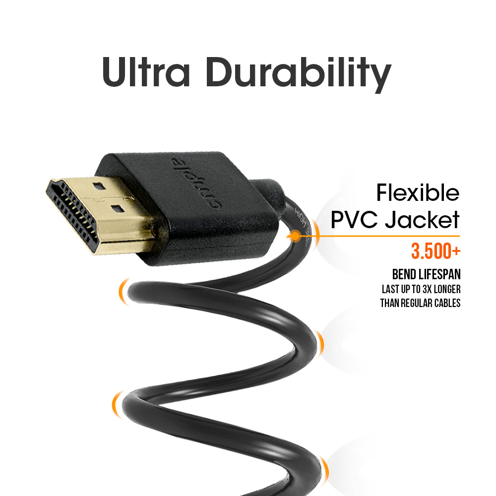 ULTRA-HD features include support for 3D, 4K x 2K UHD TV ULTRA-THIN – Super Slim HDMI cable feature an ultra-slim jacket that makes them flexible, and was specially designed for connections in tight spaces With our HDMI Cables you have a pure digital connection between HDMI-equipped display devices and HDMI-enabled digital video sources. ULTRA-HD – The cable is 3D, 4K x 2K – compatible and offers high-speed Internet connectivity – no need for a separate Ethernet cable. With the ability to support audio return channel, the super slim cable also allows TVs to return audio to an AV receiver or other audio controllers. Thanks to the durable PVC jacket, you can be assured of noise-free signals, delivered through the conductor. Perfect for Installers and systems integrator, making this the perfect cable for easy installation. The male to male HDMI cable has a length of 3 feet, giving you enough room to maneuver it around your home or system. Experience the latest HDMI features including: 10.2Gbps data throughput ULTRA-HD features include support for 3D, 4K x 2K UHD TV 4K-Support: Video Resolutions up to 4096 x 2048, 480i, 480p, 720p, 1080i, 1080p, and 2560 x 1600 resolution Fully HDCP compliant to provide highest level of signal quality A superb cable with excellent audio-visual transfer properties that deliver signal without compromising purity and balance Excellent audio-visual transfer properties that deliver signal without compromising purity and balance Delivers vibrant and rich colors Gold-plated terminals ensure long-lasting, corrosion-free connections Ethernet Channel for sharing Internet between HDMI devices HDMI cable with Audio Return – Combines both audio and video into one cable. Color: Black Length: 15 FT