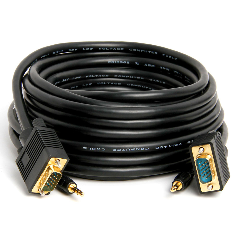SVGA/VGA HD15 male/male monitor cable with attached 3.5mm stereo cable, gold-plated connectors. 25 ft, double-shielded coax for connecting HDTV video and audio signals to computer monitors