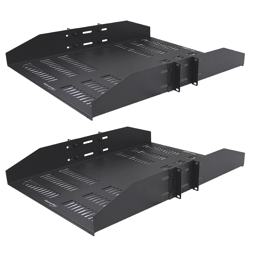 2U Rack Mount Vented Shelf (SHELF-10SSV-S2PK) The servers deployed at data centers require particular management and handling to ensure that the overall system works efficiently. In a cluttered rack, space is an urgent necessity. By utilizing a double-sided shelf, you can increase not only the room but also the weight capacity of your shelf. This is a must-have for anyone with a rack that needs space extension.At 25 inches deep from edge to edge, this vented shelf unit is perfect for any custom network rack build. Great for in-studio work, on-stage performances, or even smaller home network solutions. It is easy to install, sturdy enough, and comes at a very economical cost. This model is highly recommended!The vented rackmount cantilever tray improves consistent airflow around devices on the shelf and within the rack to effectively dissipate heat on your equipment. Also, the max weight load capacity of this model is 50lbs (22.5 kg), and it is fully compatible with all EIA/ECA‐310‐E compliant 19-inch server racks and server shelves.Constructed using SPCC commercial-grade cold-rolled steel with an adept look black powder-coat finish that ensures that they keep all edges. Smooth surfaces reduce the possibility of injury or wear on cable jackets. Ergonomic design and secure attaches ensure to take up minimal space for more equipment and wiring distribution options.Features:Takes up 2 Units SpaceCompatible with standard 19-inch racksHave vented bottom and double‐sided 25” deepCompatible with standard 19-inch wide equipmentUsed with 2‐Post, 4‐Post Racks, cabinets, and wall racksPackaged in 2‐Pack saves space and is good for shippingMaterial: 16-Gauge Cold Roll SteelColor: Black Powder CoatingMaximum capacity: 50 lbs (22.5 kg)Package Includes:2 x 2U 25inch Vented Bottom, Double‐Sided Rack Shelf16 x #12‐24 Mounting Screw