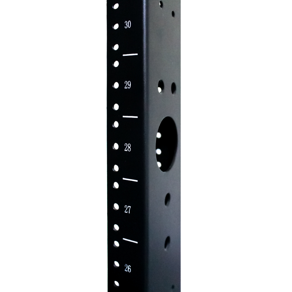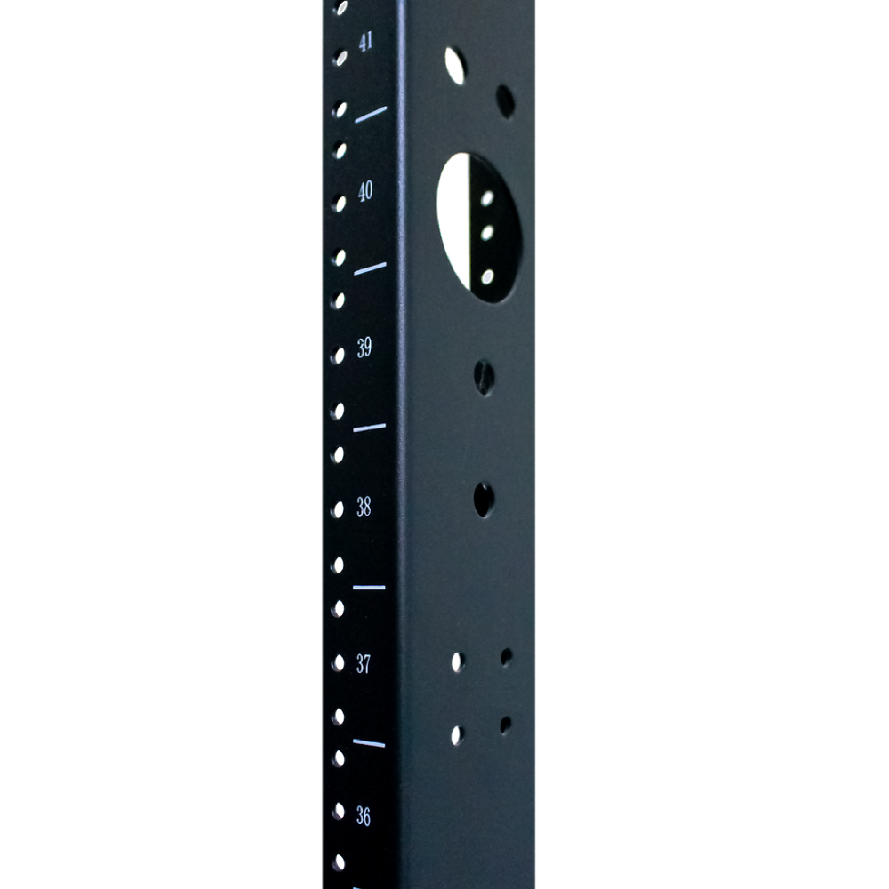 2 Post 45U Free-Standing Server Rack (2-POST-45U) The fact that you may run the cables with obstacles from doors and panels won’t frustrate you when using an open frame rack. It is just formed by 2-post racks with no limitations to each orientation. With this rack, you will no longer consider whether it can contain all your applications within the space.This 45U server rack was designed for the best user-friendly installation of active- and passive network components accompanied by neat cable management. When you deploy equipment and organize cables in a computer room or data center, it is important to make proper and reasonable space utilization.The open-rack is easy to assemble using the included hardware. Only standard hand tools are required for setup. The vertical mounting rails have threaded 12-24 holes and cable management slots for securing equipment. Features convenient toolless button-hole mounting for vertical PDUs and cable managers.This 2 post rack features heavy-duty aluminum construction, with a black powdered coated finish that ensures that they keep all edges and surfaces smooth, greatly reducing the possibility of injury or wear on cable jackets. With compact size and small weight, open frame server racks come at the right time to help stay organized cost-effectively.Features:Compatible with: 19inch wide equipmentNumber markings on rails #12-24Round threaded/numbered mounting holesToolless mounting for vertical PDUs and cable managersMaterial: Aluminum extrusion with a powder finishMaximum capacity: 1000lbs(453,5kg)Product ships unassembled Package Includes:2 x Top Rail2 x Side Rail2 x Base1 x Mounting Hardware Kit